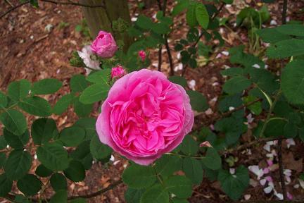 Graceful, arching shrubs often 6 feet tall or more. Foliage is generally rough-textured with a gray-green leaves that have a pale silvery reverse. The leaf at the end of the branch (terminal leaflet) often is folded in half and held at a downward angle. Canes have very large, sharp prickles. Flowers range from white to a reddish pink. Fragrance is intense and these are the roses most often grown for the rose perfume trade. Damasks are very winter hardy and do not need to be sprayed for disease. Damasks can be sub-divided into Summer Damasks and Autumn Damasks. The two groups are differentiated by their bloom cycles. Summer Damasks only bloom once in the summer while Autumn Damasks bloom in the summer and again in the fall. Examples: Rosa x damascena 'Triginitipetala' or 'Kazanlik' - lovely, loose double flowers in pink, grown in Turkey to produce Attar of Roses. Rosa x damascene 'Bifera', 'Quatre Saisons' or 'Autumn Damask', an occasionally remontant variety, thought to be the rose mentioned by Herodotus in the 5th century BC, growing in King Midas' gardens. Loosely double blossoms in pink. 'Celsiana' - an extraordinarily gorgeous flower in pale pink fading to white with an intense perfume. The translucent petals are unbelievably sensual and beautiful. Alba