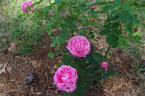 between the Dog Rose ( Tall, thorny shrubs, reaching to six feet on up. Foliage is blue-gray and rather soft. Flowers are white to pale-pink and are generally fragrant. Alba roses are very cold-tolerant, should not be sprayed, and will tolerate some shade and drought. Examples: Rosa x alba 'Semiplena' with pure white flowers nearly 3" across. 'Cuisse de Nymphe' or 'Great Maiden's Blush' - beautiful double, pale pink flowers, flushed deeper pink in the middle. Wonderful rose scent. Centifolia Medium-tall, perhaps 5 feet in height, rather lax bushes with numerous thorns. Soft, pale green leaves. Large, petal-packed flowers that are deeply globular. Very fragrant. Examples: Rosa x centifolia or 'Old Cabbage Rose' - a lush, double rose in rich pink with a wonderful rose fragrance. "Unique Blanche' or 'White Provence Unique' - a pure white double rose discovered at Needham in Suffolk in 1775. Moss They are very similar to Centifolia Roses in appearance. Medium-tall, perhaps 5 feet in height, rather lax bushes with numerous thorns. Soft, pale green leaves. Large, petal-packed flowers that are deeply globular. Mossing in either green or brown along the pedicel and sepals. Very fragrant. Examples: Rosa x centifolia 'Muscosa,' 'Old Moss Rose,' or 'Common Moss' - the original mossy sport of Centifolia, recorded in late 17th century. Lovely double flowers in rich pink, with stems and sepals covered in green moss. 'Shailer's White Moss,' ' White Bath,' or 'Centifolia Muscosa Alba' - The white sport of the Common Moss, appeared in 1788. And now we start getting into Autumn Flowering classes of roses. One note: with the introduction of yellow roses, we also got the disease black spot, so this was not entirely felicitous. Reblooming roses are, unfortunately, very prone to this disease. Small to medium (5 feet) tall shrubs with thin, twiggy canes. Abundant small prickles. Foliage is narrow, lance-shaped, and generally dark green. Small flowers are generally produced in clusters, often held “above” the shrub in a very graceful, airy manner. Colors range from